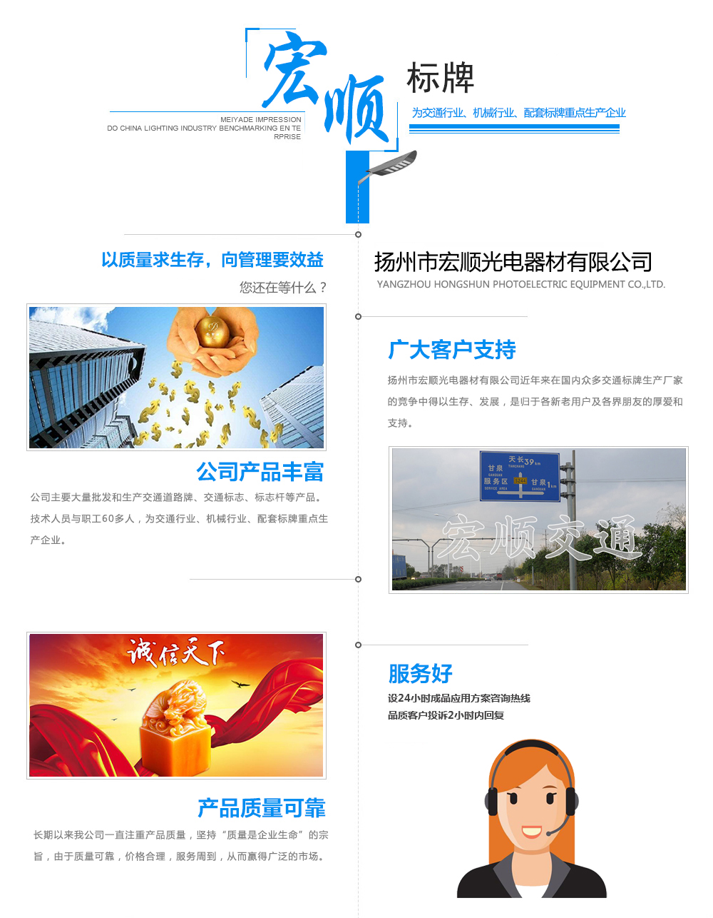 揚州市宏順光電器材有限公司近年來在國內(nèi)眾多交通標牌生產(chǎn)廠家的競爭中得以生存、發(fā)展,是歸于各新老用戶及各界朋友的厚愛和支持。我們?nèi)w員工向你們致以誠摯的感謝。 為使我們共同步入新世紀,提高我們的產(chǎn)品質(zhì)量與服務希望對我們提出寶貴的意見,使我們不斷改進、創(chuàng)新。 我們將和過去一樣,視今天的質(zhì)量為明天的市場。為您奉獻滿意的各種精品,為美化我們的交通事業(yè)做出貢獻。 公司主要大量批發(fā)和生產(chǎn)道路交通標志牌、道路指示牌、交通標志牌、指路牌、反光標志牌等產(chǎn)品。技術人員與職工60多人,為交通行業(yè)、機械行業(yè)、配套標牌重點生產(chǎn)企業(yè)。 長期以來我公司一直注重產(chǎn)品質(zhì)量,堅持“質(zhì)量是企業(yè)生命”的宗旨,由于質(zhì)量可靠,價格合理,服務周到,從而贏得廣泛的市場,近年來隨著交通事業(yè)的開發(fā)和研究,傾聽用戶的意見,使得我們在市場競爭中不斷發(fā)展壯大。 我們本著“質(zhì)量可靠、信譽優(yōu)先、用戶至上”的宗旨,“以質(zhì)量求生存,向管理要效益”的信條,竭誠為... ...【查看更多】